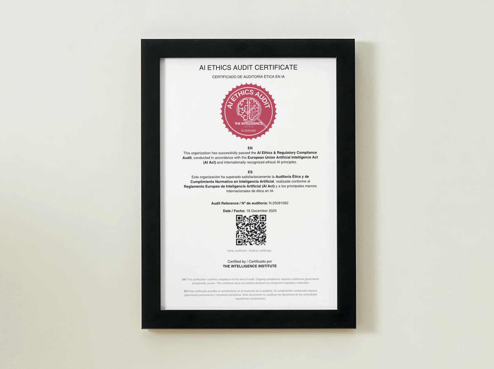 La certificación AI Ethics Audit se concede conforme a los criterios del AI Act (UE), el marco normativo europeo que regula el desarrollo y uso de la inteligencia artificial para garantizar que sea segura, transparente y respetuosa con los derechos fundamentales.